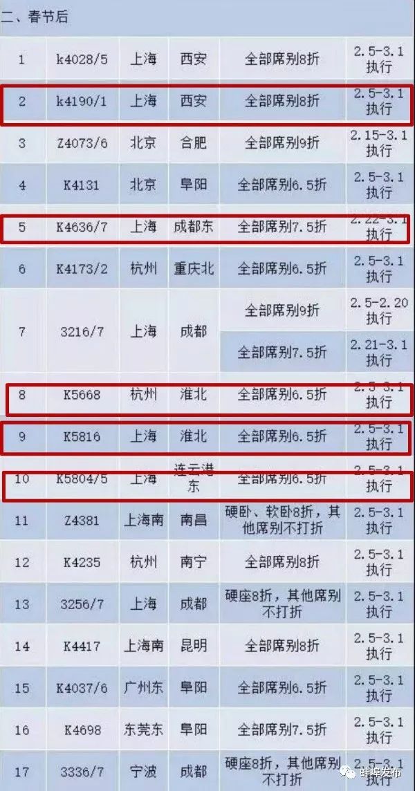 春节后,打折的车次主要是上海、北京、杭州等地前往西安、淮北、南昌、昆明等地。