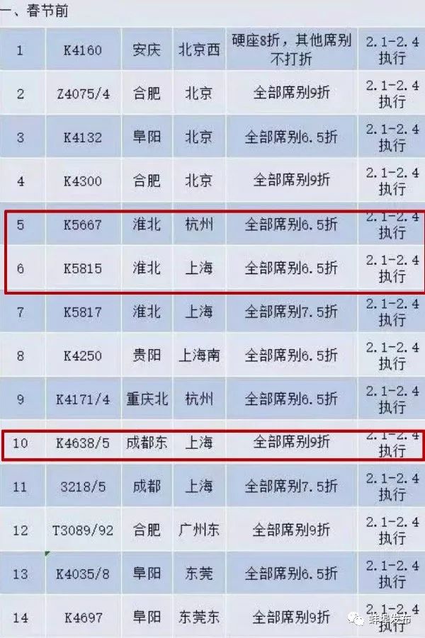 春节前,打折的车次主要是安庆、阜阳、贵阳、重庆、成都等地前往北京、上海、杭州、广州等地;