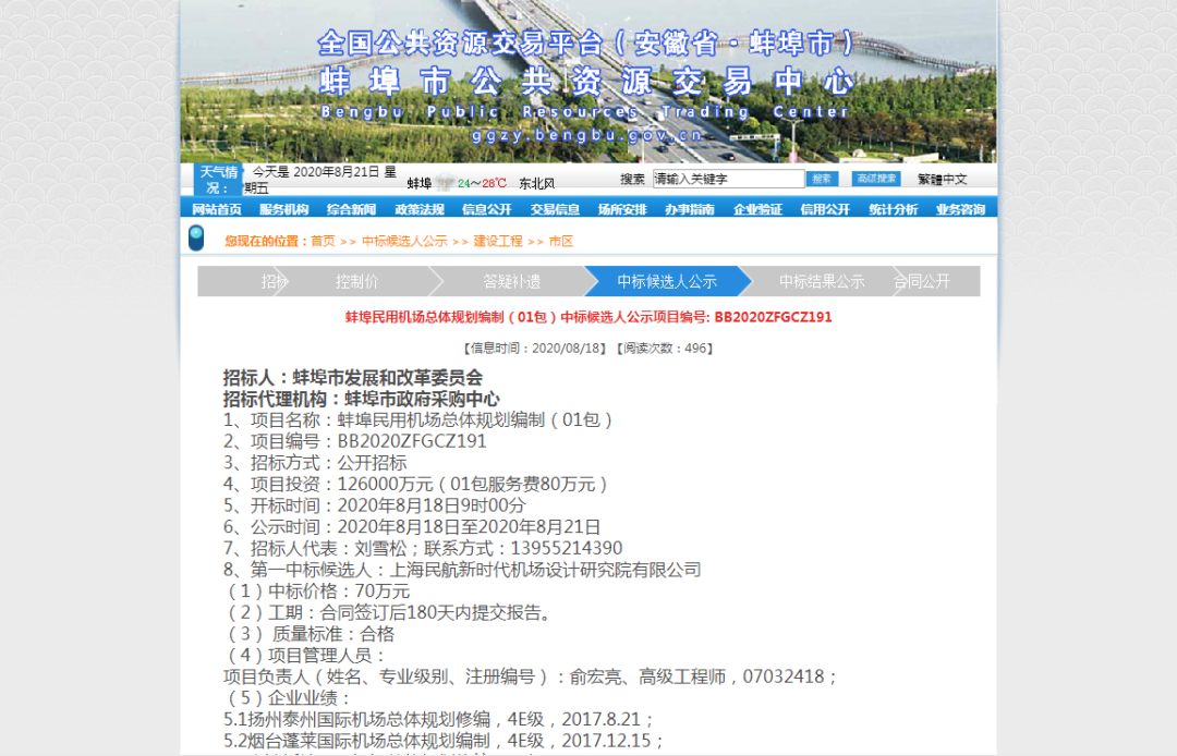 7月底,蚌埠市公共资源交易中心发布一则招标公告,招标项目为:蚌埠民用机场总体规划编制。8月底,市公共资源交易中心官网又发布了:蚌埠民用机场总体规划编制(01、02包)中标候选人公示。