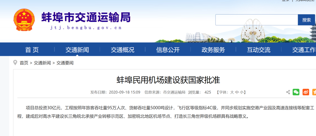 9月18日,蚌埠市交通运输局官方发布:“蚌埠民用机场建设获国家批准”。内容提到:“项目总投资30亿元,工程按照年旅客吞吐量95万人次、货邮吞吐量5000吨设计,飞行区等级指标4C级,并同步规划实施空港产业园及高速连接线等配套工程,建成后对高水平建设长三角皖北承接产业转移示范区、加密皖北地区机场节点、打造长三角高级机场群具有战略意义。”
