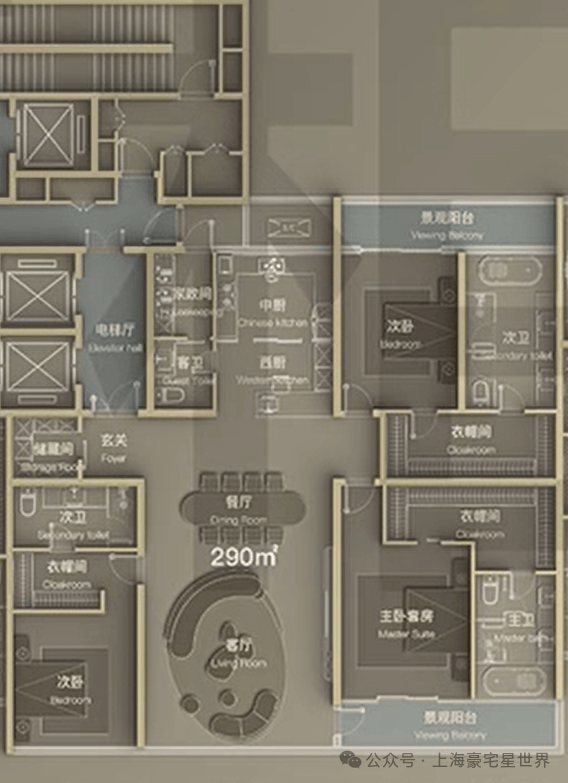 建面约290㎡三室两厅四卫