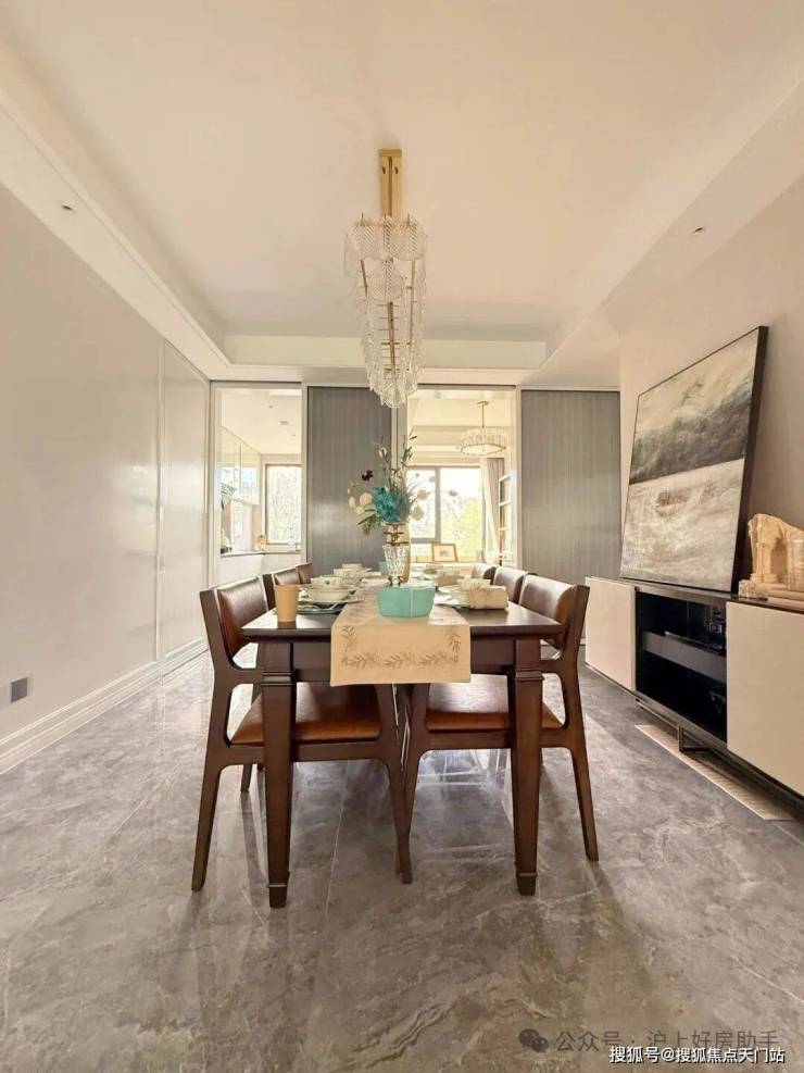 餐厅则北连现代化厨房,南北通透的采光设计,让美食与光影共舞。设计师还巧妙地将传统直墙转化为流畅的S型曲线,不经意间创造出额外的凹槽空间,可以安置冰箱或定制柜体,极大提升厨房的收纳与操作便捷性。