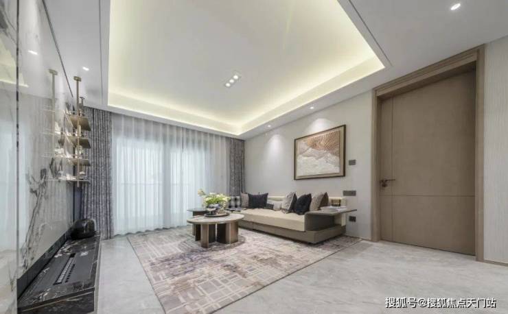 以主打的建面约100平米3房2厅2卫为例,进入样板间,首先映入眼帘的是设计感满满的入户玄关,轻卡门手感厚重,搭配飞利浦智能锁高端系列产品,品味与安全感相得益彰。门后的定制柜巧妙设置了玄关造景金属壁龛柜及女王高靴放置区,实用且大气美观,让归家的第一步就充满温馨与尊贵。
