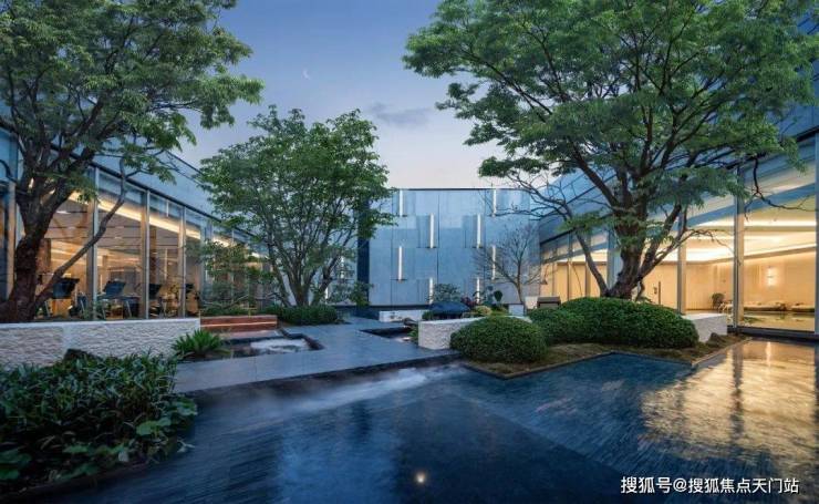 而人行线路则由星级酒店式的入户大堂进入,接着便是6S会所环绕的下沉式水景庭院,7米高磅礴大气的跌水景墙配合三棵参天乌桕林和原石、浮桥交错的地面水景,若是傍晚归家,还能欣赏倒映在水中的点点星光,可谓满满的奢雅意境和尊贵仪式感!