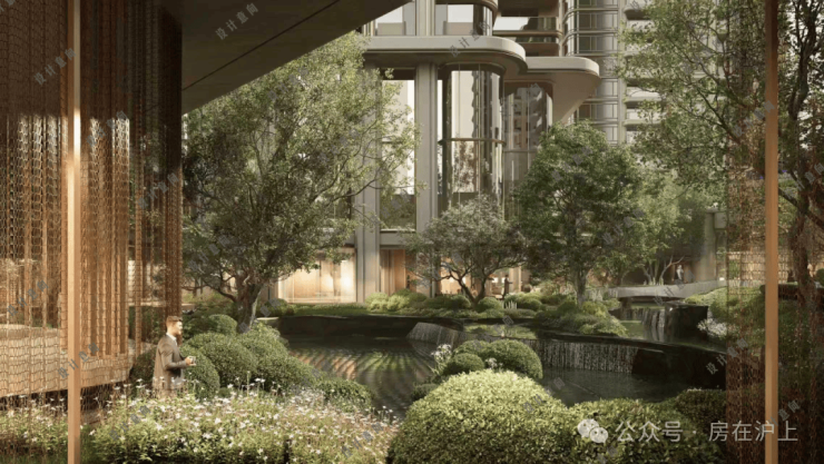 三层归家动线:从地面景观层到架空层,再到入户层,穿越绿植、光影与水景,步步进入私域。
