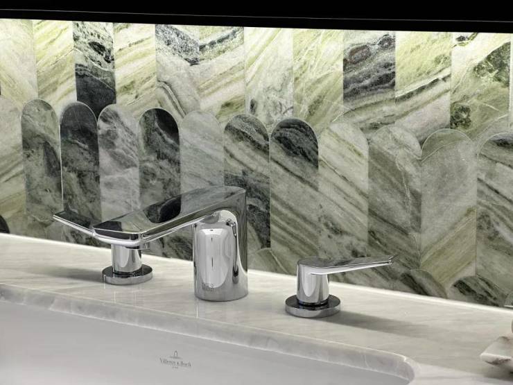 卫生间大量采用奢石和石材,比如主卫柜体墙面就是香格里拉翡翠拼花,龙头是冷热分离式,成本更高。