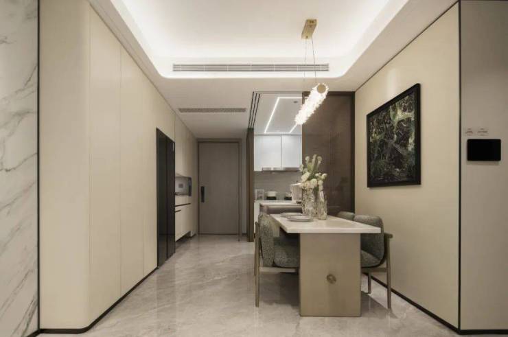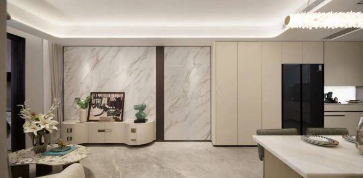 值得一提的是,入户玄关设置一整面的玄关柜空间,左侧分户墙处增设“凹型空间",预留内嵌双开门冰箱空间。