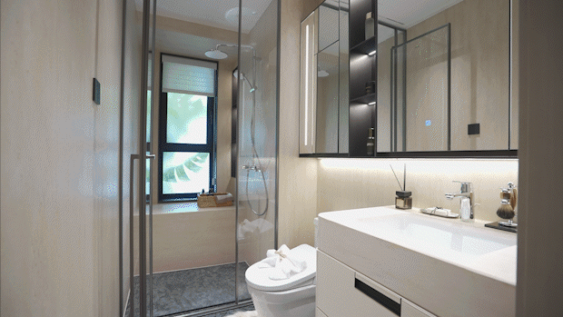 次卫墙面统一采用米洞岩板、地面为深咖色瓷砖,下柜同样是皮革包裹交付。