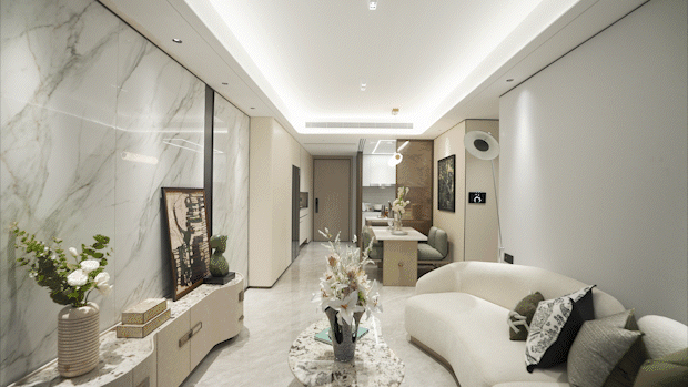 全屋多维收纳空间,在分户墙处增设“凹型空间",玄关/烟道处/卧室/卫生间定制收纳空间扩容,把更多隐藏空间打造成超级收纳功能。