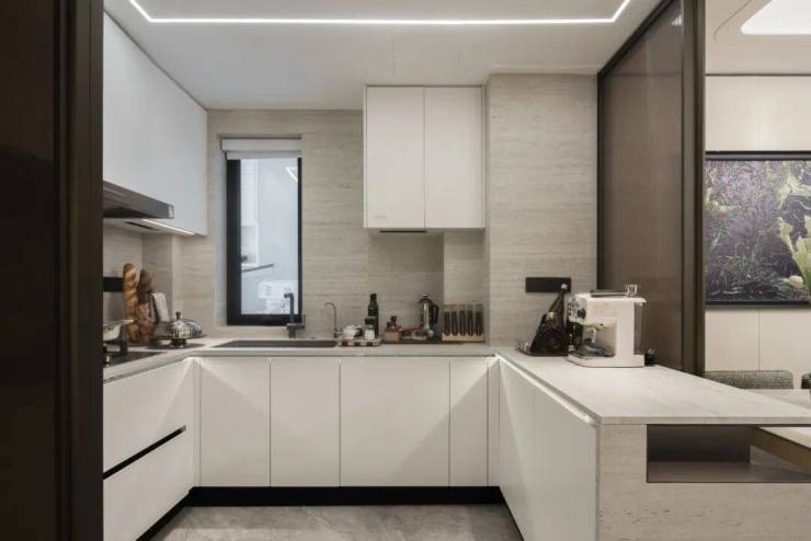 项目厨房使用美诺的抽油烟机、灶具和洗碗机三件套交付,博洛尼橱柜、达克密瓷岩板等,台面是全进口的西班牙DEKTON品牌。