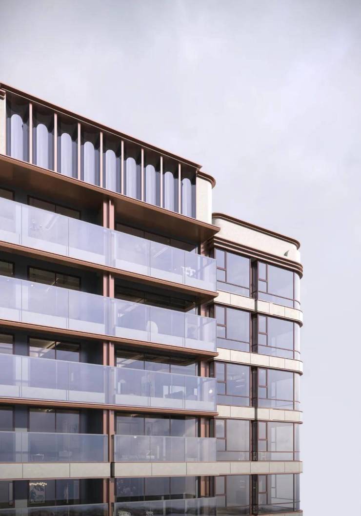 高层立面建筑的色彩以浅色做为主基调,采用石材与局部的涂料工艺,大量的落地玻璃之间,镶嵌了古铜色的金属板材,与风貌建筑的色彩形成呼应。
