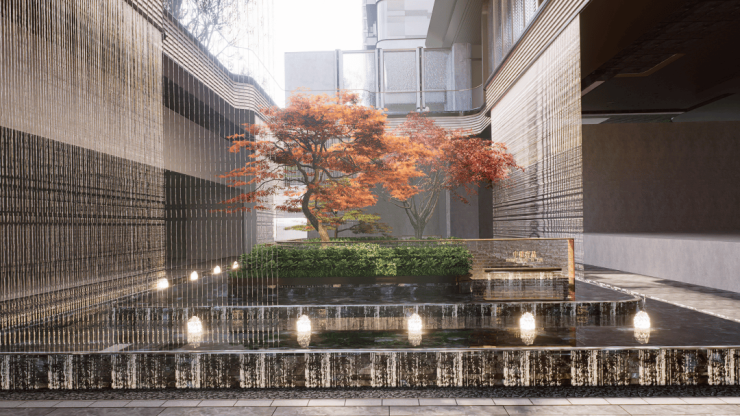 下沉庭院整体长约18米,进深约9.5米,庭院的上下景观通过水帘相连通,中间结合有着层层叠水的水景,搭配水晶砖的景墙,将品质感拉满。