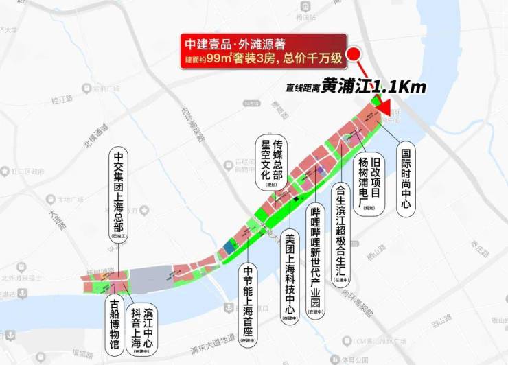 项目与黄浦江直线距离约1.1公里,项目与国际时尚中心直线距离不到1公里,与超极合生汇(在建)直线距离约1.2公里,可谓是近水楼台。