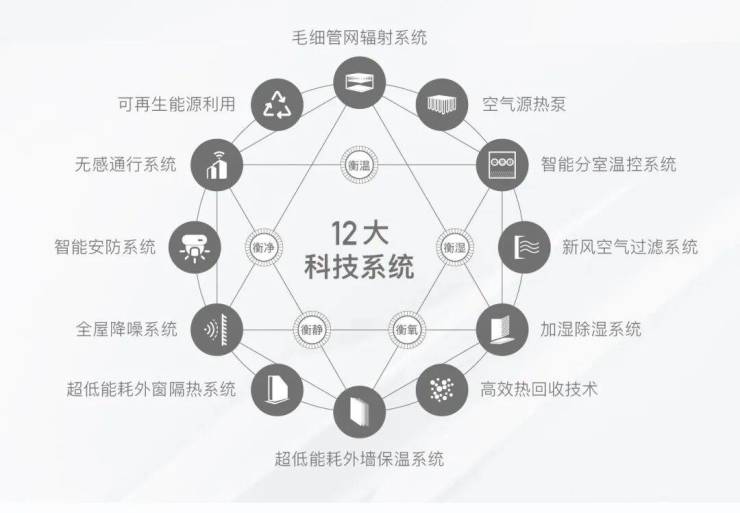 首先是户式科技系统。该系统以“衡温、衡湿、衡氧、衡净、衡静”系统为理念。由空气源热泵、高效热回收调湿新风机组、毛细管网、自控系统等组成。