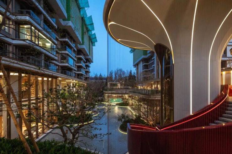 示范区核心包含约1600㎡下沉庭院,融入山、水、瀑、林等自然元素,形成可沉浸的生活场景;双桥跨水归家系统,提升归家仪式感。同时配置约3000㎡双会所,涵盖双层书吧、健身等功能空间,满足多元需求。