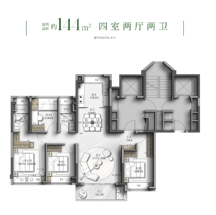 项目推出建面约114、126、144㎡3-4房,偏改善,满足不同家庭需求。
