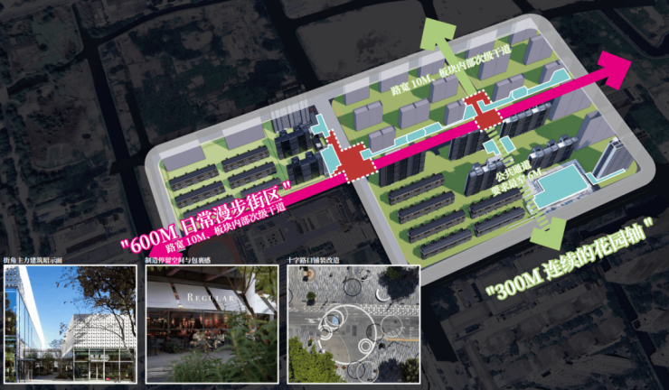 这些丰富的生活场景,则由两条景观轴线串联:一条是约300米的连续花园轴;一条是约600米的日常漫步街区。与此同时,项目在街角处还打造了多个口袋公园!