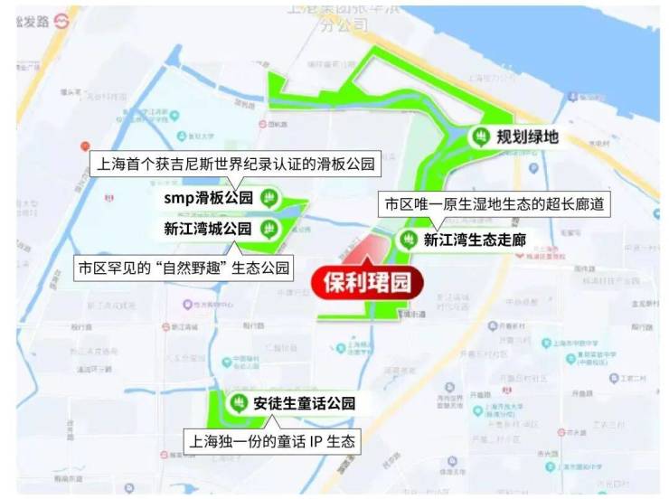 新江湾城拥有四大城市公园,其中项目西侧有约7.35万公顷的新江湾城公园,SMP滑板公园,安徒生公园,项目北侧和东侧是约24万方的生态走廊,还有9条天然水系,聚集了200多种鸟类。