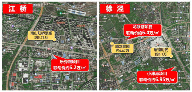 徐泾小涞港项目,房地联动价约6.95万/㎡,该地块同板块同类型产品为约6.87万/㎡的蟠龙景园,与其相较上调约800元/㎡。