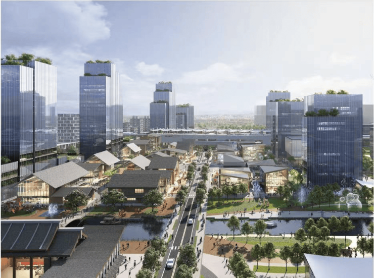 作为城市发展商角色的中交城投,正在为华新未来的发展谋划一盘“大棋”,打造以示范线-徐乐北路站TOD为主导,通过以历史文脉、科创体验及绿色生态为核心的复合站前体验区;打造科创TOD街区,融合了东方水镇,生态与文化的交融,形成“街、桥、寺”的水镇空间。