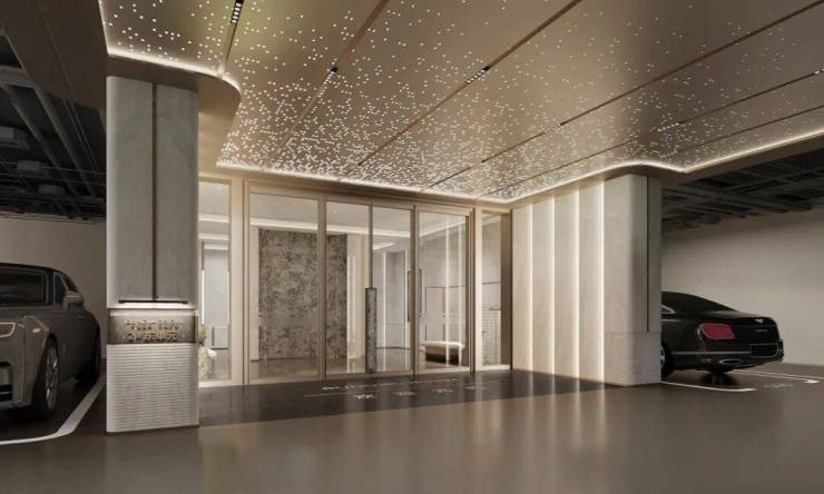 公区配套都如此高了,双大堂就更不可少了。首层大堂结合金属连廊,配以大面积的玻璃幕墙,4米挑高;地下大堂则直接连接了停车系统,整个地下空间做了天地墙的材料铺设,其中地下的落客区用了星光顶,地面是水墨地坪,车库的入口用的是铝板和石材。