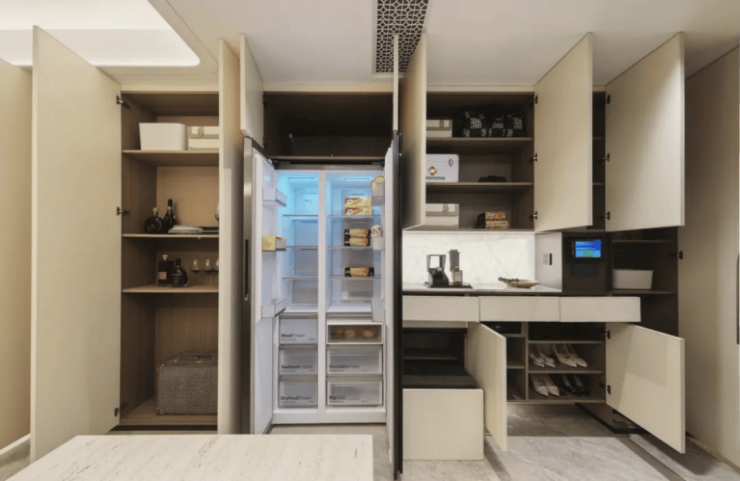 在交付标准里,有大量的不同材质的应用,比如铸铝门贝母的拉手、金属的移门,厨房系统里运用大量岩板桌面和墙面的铺设……