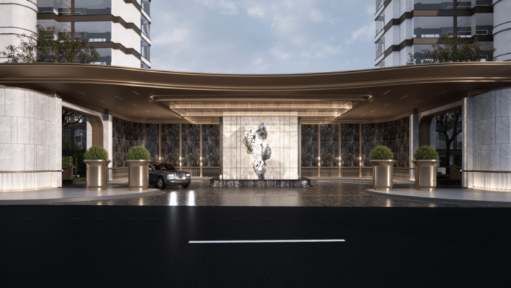 从归家动线的角度来看,首先是项目的门头系统,与一般社区的大门是不一样,它长约30米,深约20米,面积约600平,车行进入以后,首先有一个酒店式环岛落客区。当中有一块水系凿壁用的是透光的奢石,背景墙面用的是维多利亚的黑大理石,顶棚用的是带层次感的金属隔栅。