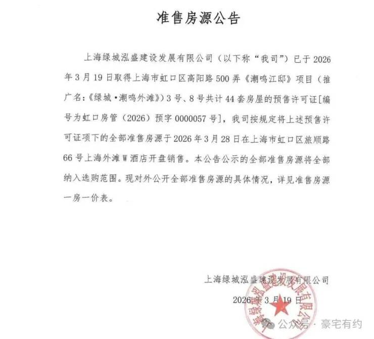 认购时间:2026年3月20日-3月24日12:00止绿城·潮鸣外滩
