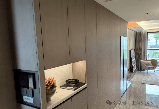 入户玄关处,包含冰箱上柜的整面木饰面都是交付标准,首批次房源额外赠送西门子双开门冰箱更是亮眼配置,同价位新房从没有配备过冰箱作为交付标准;