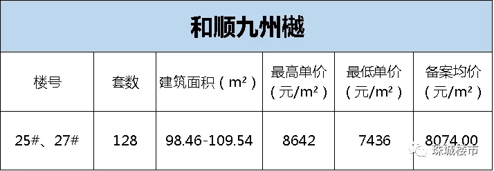 从表格数据看出,和顺九州樾此次备案楼栋25#、27#共计128套房源,其中备案价较高单价为8642元/㎡,较低单价为7436元/㎡,备案均价8074元/㎡;