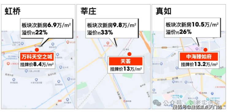 再来看土拍市场,今年3月初,嘉定新城F03A-4地块出让,经过49轮激烈竞拍,溢价率30%封顶成交,楼面价高达31850元/㎡。而它旁边的地块楼面价才2.3万/㎡,这样的跳涨幅度无疑是惊人的。