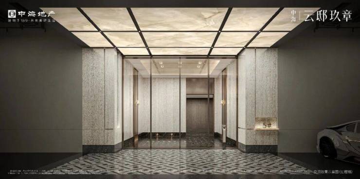 主入口约7米高约40米宽的奢华门头、挑高式的古铜色星空顶,地面选用天然大理石交织,进一步增强归家落客区的奢华感。