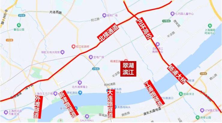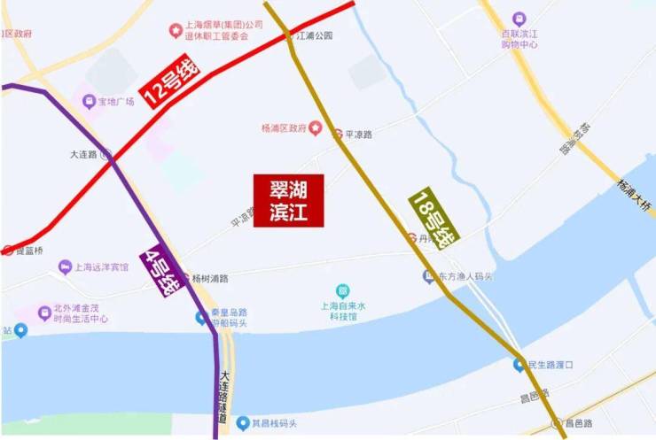 交通方面, 周边1公里内有多条轨道交通,东侧约400米有18号线平凉路站,西侧约700米是4号线杨树浦路站,西北侧1公里为4、12号线大连路站。地块到东外滩滨江的直线距离约580米。