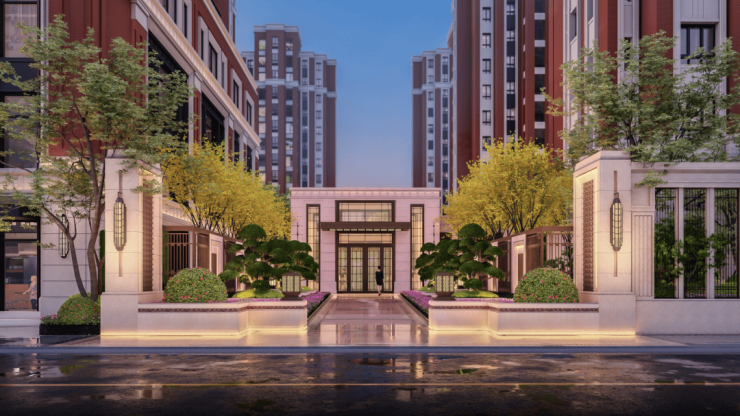 小区外立面延用紫薇系的海派建筑风格,底部采用全进口沉香米黄大理石材,三层以上爱和陶熔岩红砖与石材的搭配,用更当代的材质、工艺、美学再造别样的海派韵味,无惧时光流转,经典永不落寞。