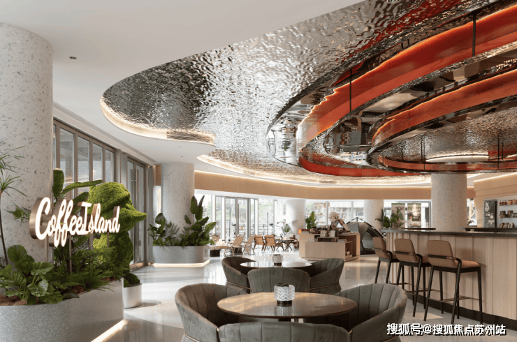8米挑空大堂仿佛打翻了艺术调色盘,银色水波纹天花板搭配落地绿植,随手一拍都是大片既视感!