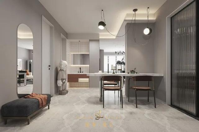 可将玄关柜横过来放,增加收纳的同时,也能提高空间的隐私性。至于选择顶天立地式还是小矮柜,根据自己对空间的收纳需求来决定即可。