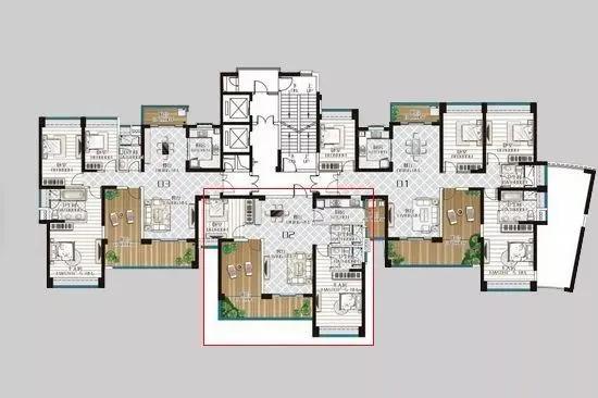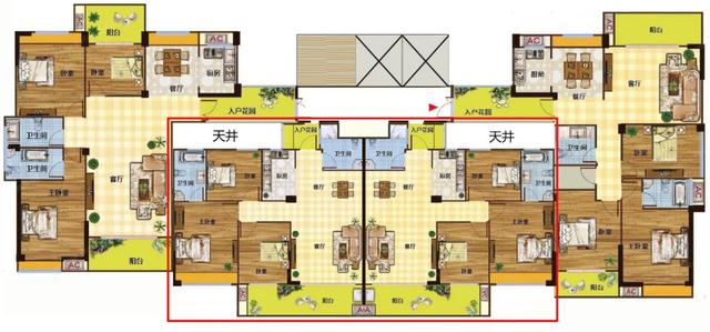 红线框出来的两家,都是中间户。就像一块夹心饼干,两边是邻居,对面是电梯,中间户就是那个”心“。这样的房子有什么优势?你别说,还真有: