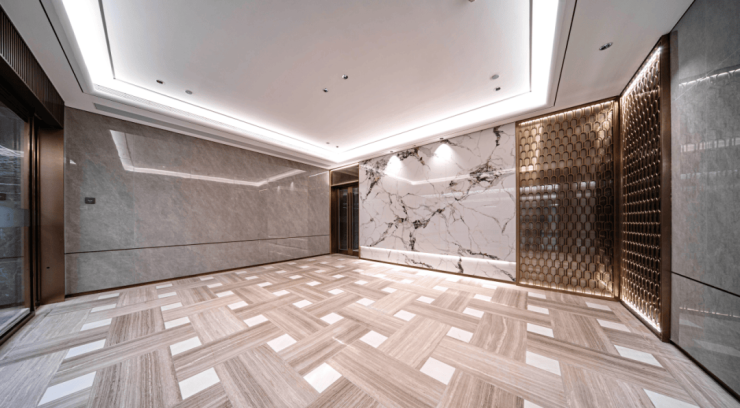 地下归家大堂,电梯厅的地面都是木纹拼花石材,呈现视觉美。