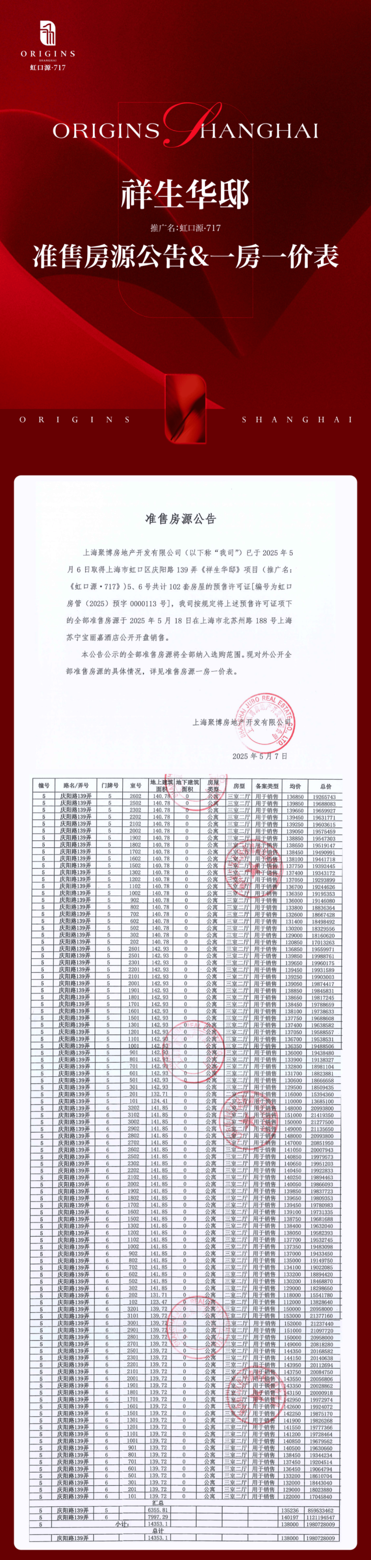 虹口源717,北外滩核芯腹地的三轨交TOD,二批次102套建面约140㎡改善大宅,加推楼王位置!新房价格上涨,项目二期约13.8万/㎡的价格与一期持平,丝毫没有上涨,可以说是非常良心了!