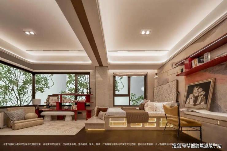 卧室的墙面是定制3D 立体墙布,有更好的隔音效果,休息的时候帮你隔绝外界的喧嚣;微弧度设计,在心理上营造出被温柔环抱的安全感,营造出静谧的助眠氛围;飘窗也可以灵活改造多种功能。