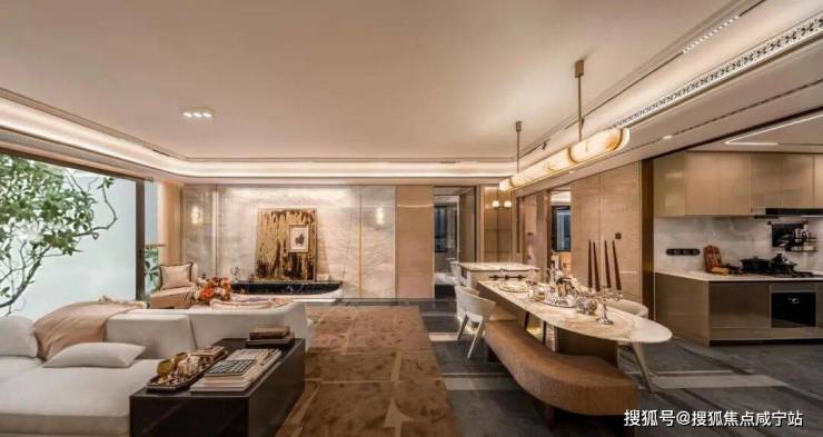 这样的设计支撑起了约26㎡的巨幕通厅,约4.2米的南向客厅开间。这样的设计,远超同面积段的常规水平,搭配全景落地窗与南向阳台,空间通透感直接拉满。餐厅区域更是能轻松放下6人圆桌,让餐厅从单纯的“吃饭区域”,升级为家庭核心社交厅。
