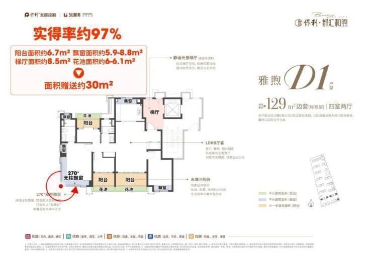 洋房标准层边套赠送面积约30㎡,实得率高达97%,相当于直接赠送约200多万价值,常规项目80%的实得率与之相比差距明显,该户型实际可享受常规155-160㎡的空间尺度。☎ 保利都汇和煦官方售楼处专线:400-997-2220