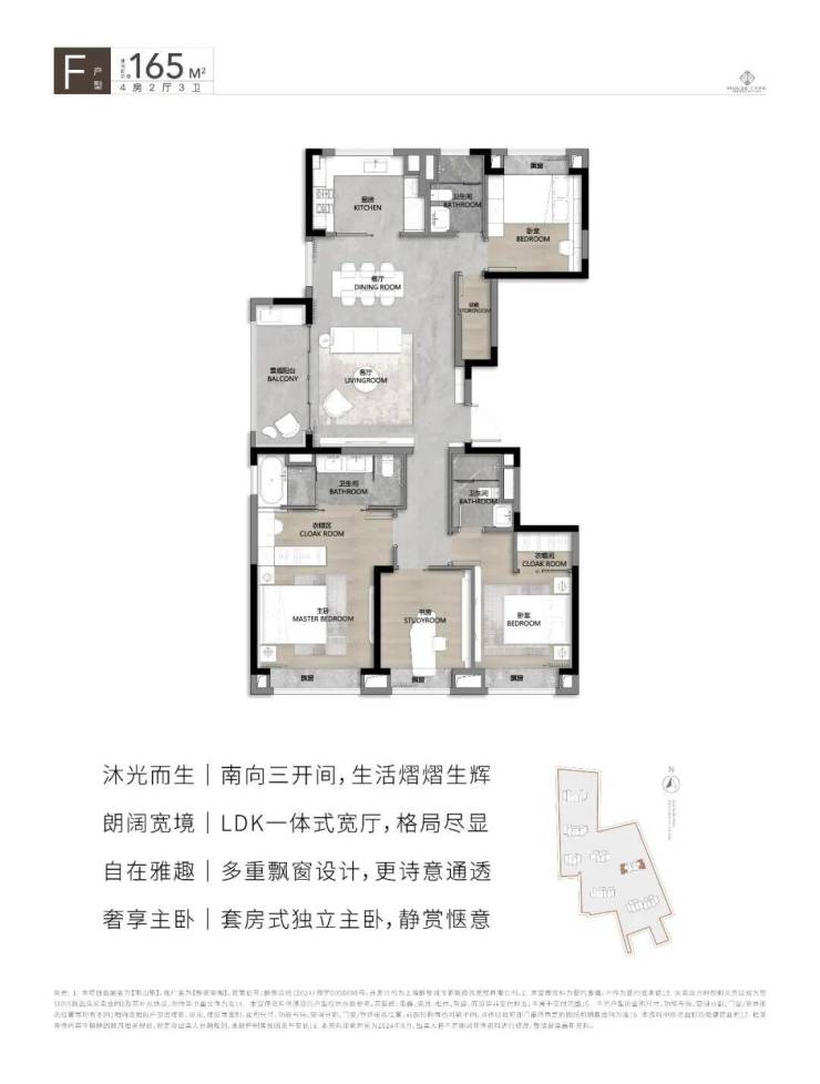 建面约165㎡的4房2厅3卫户型,南向三开间进一步扩大,LDK一体化、多重飘窗设计,为生活延展出更多可能。整体户型设计注重空间的合理利用和居住的舒适性,满足了不同家庭结构和生活需求的购房者。