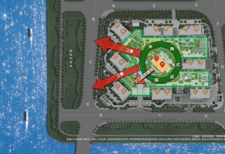 南向直面约 110 米宽的百米庄园景观,四季风光移步异景,北侧可揽黄浦江黄金 S 湾的滨江盛景,真正实现江景与园境的双重占有。