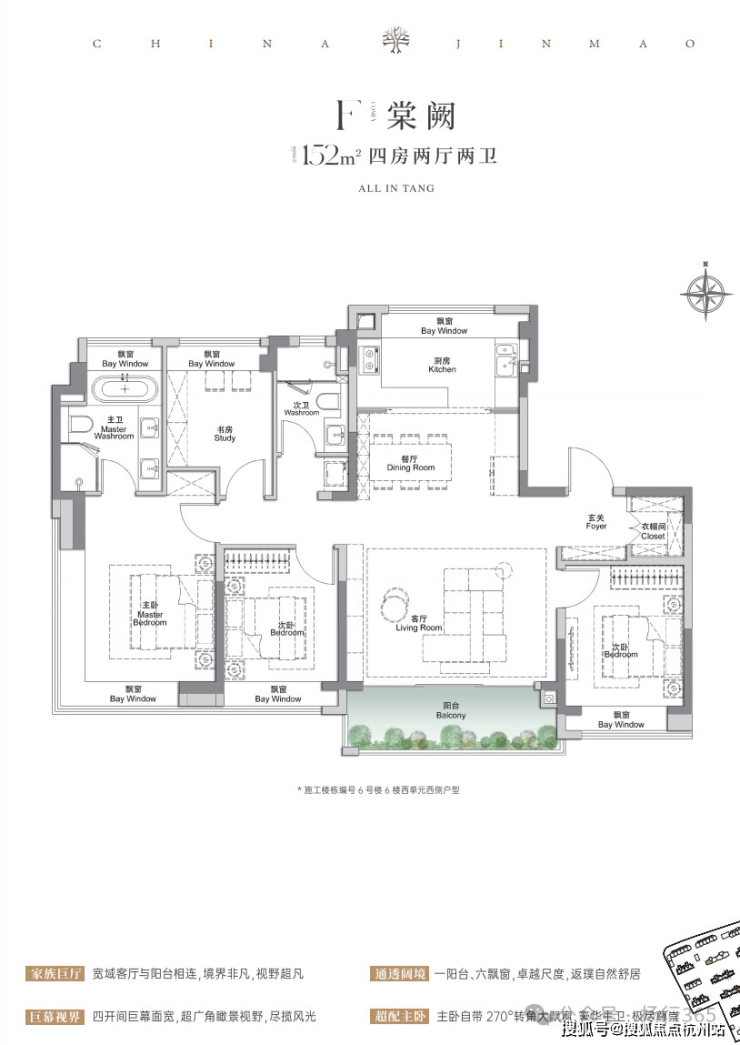 主卧带270°转角飘窗+卫生间,拥有寰宇级瞰景视野,让业主有更好的私密性和生活舒适度。