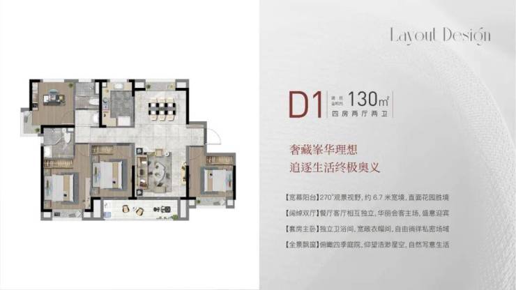 建面约130㎡4房2厅2卫,做到了四开间朝南+南北通透+主卧套房设计+双阳台设计+卫生间干湿分离,“一步到位”大4房,空间尺度非凡。