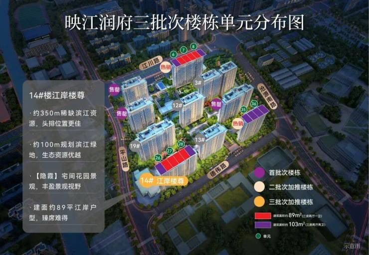 映江润府本身就是闵行一线滨江的项目,直线距离江面仅约350米,三批次加推的正是项目的江岸楼尊——14号楼,纵享一线滨江资源。