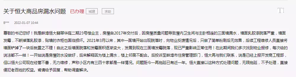 蚌埠恒大业主称:新房交付4年频繁出现漏水、掉墙皮等问题!
