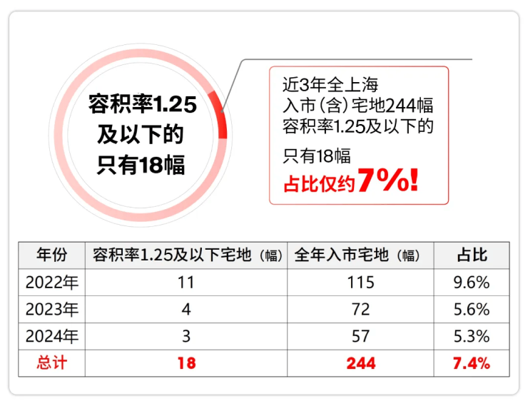 据统计,在2022年容积率1.25以下的宅地还有11块入市,2023年锐减至4块、2024年则只有3块,3年合计18块占比总市场仅约7%,稀缺属性爆表。