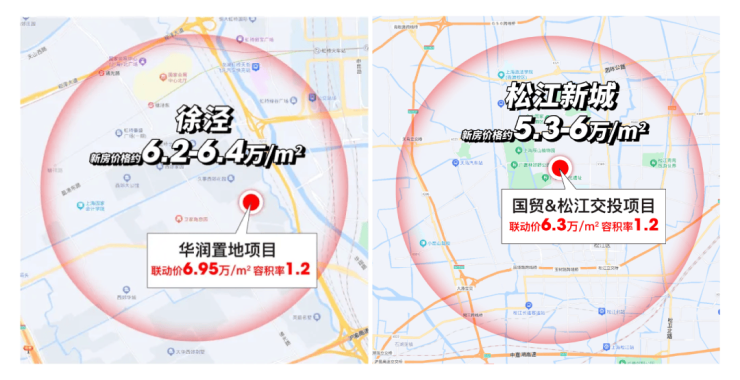 比如松江新城新房均价普遍在5.3-6万/㎡,而容积率1.2的项目的联动价高达约6.3万/㎡。(数据来源,上海土地交易市场 2023年出让土地)